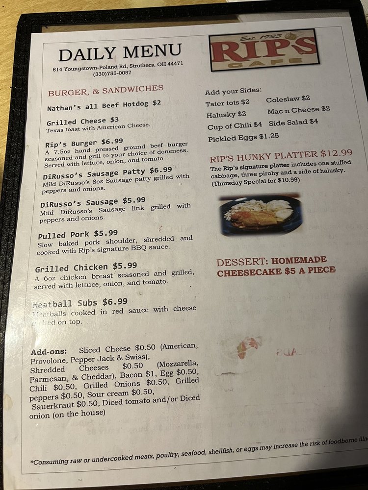 Welcome to Rip's Cafe, a gem nestled in Struthers, Ohio, where delicious food meets a vibrant atmosphere. This veteran-owned establishment doubles as a bar and café, making it an ideal spot for casual gatherings or a relaxing evening out with friends. With a diverse menu that shines with local flavors, diners rave about the stunning stuffed cabbage and stuffed Hungarian hot peppers—dish highlights that have garnered a loyal following.